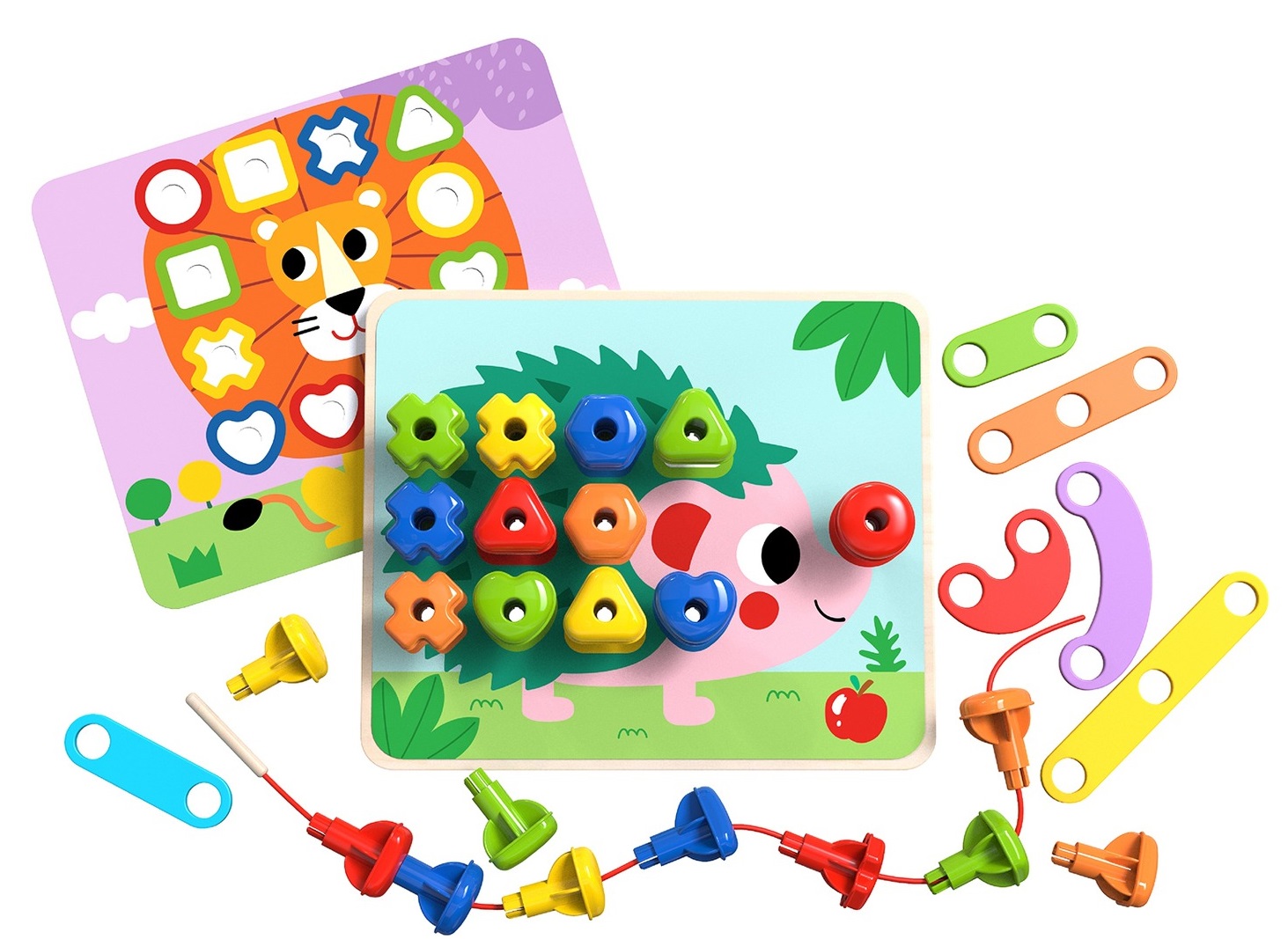 הערכה מעוצבת בצבעי הקשת ומציעה מגוון רחב של אפשרויות משחק המפתחות את המוטוריקה העדינה, זיהוי הצורות והצבעים, ותיאום העין-יד של הילד.